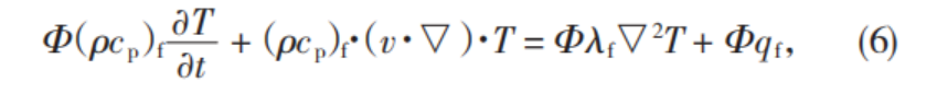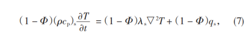 兩種能量增加帶來的溫升是基于多孔介質(zhì)材料內(nèi)的固體部分。假設固體部分的密度表示為ρs,其比熱容表示為cs。假定研究對象熱物性參數(shù),如比熱容、導熱系數(shù)等,不受到時間和空間改變帶來的影響,多孔介質(zhì)本身始終為各項同性的,并且多孔介質(zhì)材料內(nèi)部細小孔隙的容積均被流體填充,則有: