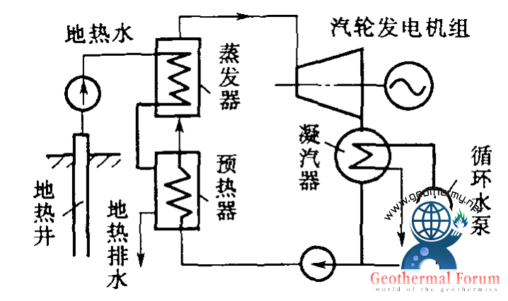 雙循環(huán)地?zé)岚l(fā)電系統(tǒng)是利用地下熱水來加熱某種低沸點(diǎn)工質(zhì),使其進(jìn)入汽輪機(jī)工作的地?zé)岚l(fā)電系統(tǒng),又稱中間介質(zhì)法或低沸點(diǎn)工質(zhì)循環(huán)。它是為克服閃蒸地?zé)岚l(fā)電系統(tǒng)的缺點(diǎn)而出現(xiàn)的一種循環(huán)系統(tǒng)。地下熱水用深井泵抽到地面進(jìn)入電站內(nèi)的蒸發(fā)器,加熱某一種低沸點(diǎn)介質(zhì)(如氟里昂11、氯乙烷等),使之變?yōu)榈头悬c(diǎn)介質(zhì)蒸氣,然后通入汽輪機(jī)做功發(fā)電,汽輪機(jī)排出的乏汽經(jīng)凝汽器冷凝成液體,用工質(zhì)泵再打回蒸發(fā)器重新加熱,循環(huán)使用。為充分利用地?zé)崴?/a>的余熱,讓從蒸發(fā)器排出的地?zé)崴?/a>經(jīng)過一個(gè)預(yù)熱器先預(yù)熱來自凝汽器的低沸點(diǎn)工質(zhì)液體,使其溫度上升至接近蒸發(fā)器內(nèi)的工質(zhì)飽和溫度,再進(jìn)入蒸發(fā)器。為了保證從地?zé)峋?/a>來的地?zé)?/a>水在輸送過程中不閃蒸成蒸氣和不使溶解氣體從水中逸出,在管路中的熱水始終保持超過其溫度對(duì)應(yīng)的飽和壓力。
