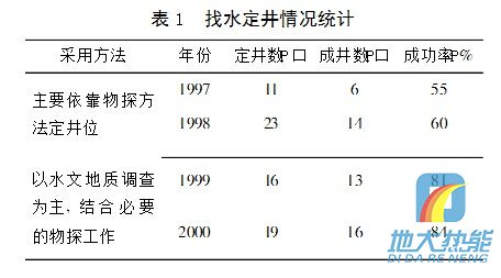 前幾年某單位在水文地質(zhì)領(lǐng)域剛起步,經(jīng)驗(yàn)不足,找水主要依靠物探工作,片面追求效率,急于求成,效果很不理想。后來意識到了基巖裂隙水地區(qū)水文地質(zhì)調(diào)查工作的重要性,及時調(diào)整了思路,加強(qiáng)了這方面的工作力度,取得了比較好的結(jié)果。近幾年來基巖裂隙水地區(qū)定井成功率見表1。