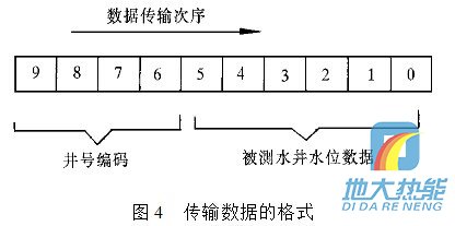 現(xiàn)在通過(guò)單片機(jī)輸出控制一組由三極管組成的電子開(kāi)關(guān),由電子開(kāi)關(guān)代替按鍵功能完成數(shù)據(jù)輸入.例如:要傳輸十進(jìn)制數(shù)據(jù)0,1,2,3,4,5,6,7,8,9,單片機(jī)依次輸出接通雙音頻編碼器輸入數(shù)字按鍵0,1,2,3,4,5,6,7,8,9對(duì)圖4 傳輸數(shù)據(jù)的格式應(yīng)的電子開(kāi)關(guān)的控制信號(hào),則該組數(shù)據(jù)經(jīng)雙音多頻編碼器轉(zhuǎn)換為雙音頻信號(hào). 雙音多頻編碼器在單片機(jī)控制下,定時(shí)“撥通”水位監(jiān)測(cè)中心電話號(hào)碼,在水位監(jiān)測(cè)中心計(jì)算機(jī)應(yīng)答并“摘機(jī)”的情況下,通過(guò)這條已接通的電話線路,將所測(cè)的水位數(shù)據(jù),經(jīng) 過(guò)雙音多頻編碼器編碼后傳送到監(jiān)控中心. 要傳輸?shù)臄?shù)據(jù)格式為:數(shù)據(jù)長(zhǎng)度為10位十進(jìn)制數(shù),其中高四位為井號(hào)編碼,低六位為所測(cè)量的水井水位數(shù)據(jù),水位數(shù)據(jù)分整數(shù)和小數(shù)兩部分.數(shù)據(jù)傳輸?shù)姆较蚴菑母呶坏降孜?數(shù)據(jù)格式如圖4所示.